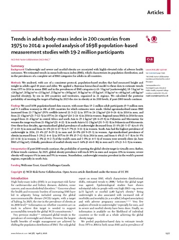 Trends in adult body-mass index in 200 countries from 1975 to 2014: a pooled analysis of 1698 population-based measurement studies with 19·2 million participants