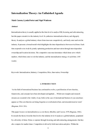 Casson, M. orcid id iconORCID: https://orcid.org/0000-0003-2907-6538, Porter, L. and Wadeson, N. orcid id iconORCID: https://orcid.org/0000-0001-8140-9307 (2016) Internalization theory: an unfinished agenda. International Business Review, 25 (6). pp. 1223-1234. ISSN 0969-5931 doi: 10.1016/j.ibusrev.2016.03.007