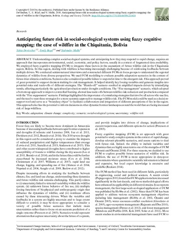 Devisscher, T., Boyd, E. and Malhi, Y. (2016) Anticipating future risk in social-ecological systems using fuzzy cognitive mapping: the case of wildfire in the Chiquitania, Bolivia. Ecology and Society, 21 (4). 18. ISSN 1708-3087 doi: 10.5751/ES-08599-210418