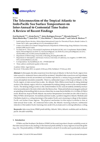 Kucharski, F., Parvin, A., Rodriguez-Fonseca, B., Farneti, R., Martin-Rey, M., Polo, I., Mohino, E., Losada, T. and Mechoso, C. R. (2016) The teleconnection of the tropical Atlantic to Indo-Pacific sea surface temperatures on inter-annual to centennial time scales: a review of recent findings. Atmosphere, 7 (2). 29. ISSN 2073-4433 doi: 10.3390/atmos7020029