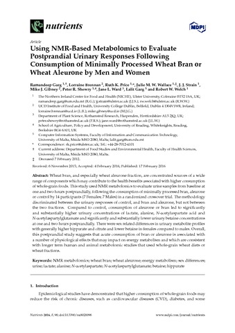 Garg, R., Brennan, L., Price, R. K., Wallace, J. M. W., Strain, J. J., Gibney, M. J., Shewry, P. R., Ward, J. L., Garg, L. and Welch, R. W. (2016) Using NMR-based metabolomics to evaluate postprandial urinary responses following consumption of minimally processed wheat bran or wheat aleurone by men and women. Nutrients, 8 (2). 96. ISSN 2072-6643 doi: 10.3390/nu8020096