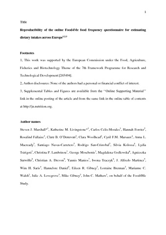 Reproducibility of the online Food4Me food-frequency questionnaire for estimating dietary intakes across Europe.