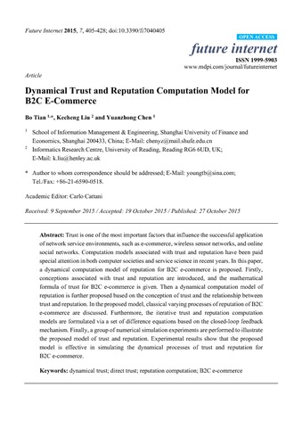 Tian, B., Liu, K. and Chen, Y. (2015) Dynamical trust and reputation computation model for B2C E-Commerce. Future Internet, 7 (4). pp. 405-428. ISSN 1999-5903 doi: 10.3390/fi7040405
