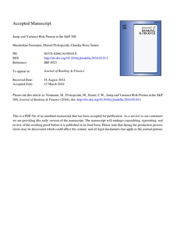Neumann, M., Prokopczuk, M. and Simen, C. W. (2016) Jump and variance risk premia in the S&P 500. Journal of Banking and Finance, 69. pp. 72-83. ISSN 0378-4266 doi: 10.1016/j.jbankfin.2016.03.013