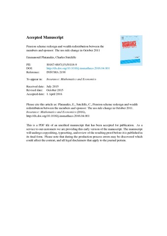 Platanakis, E. and Sutcliffe, C. orcid id iconORCID: https://orcid.org/0000-0003-0187-487X (2016) Pension scheme redesign and wealth redistribution between the members and sponsor: the USS rule change in October 2011. Insurance: Mathematics and Economics. ISSN 0167-6687 doi: 10.1016/j.insmatheco.2016.04.001