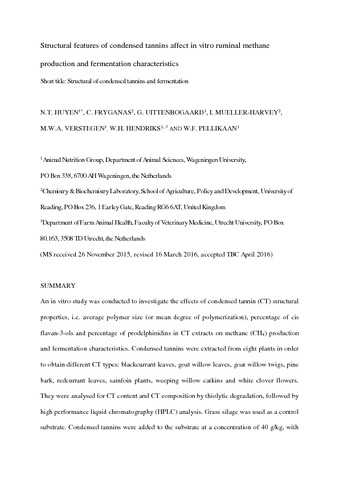 Huyen, N. T., Fryganas, C., Uittenbogaard, G., Mueller-Harvey, I., Verstegen, M. W. A., Hendriks, W. H. and Pellikaan, W. F. (2016) Structural features of condensed tannins affect in vitro ruminal methane production and fermentation characteristics. Journal of Agricultural Science, 154 (8). pp. 1474-1487. ISSN 0021-8596 doi: 10.1017/S0021859616000393