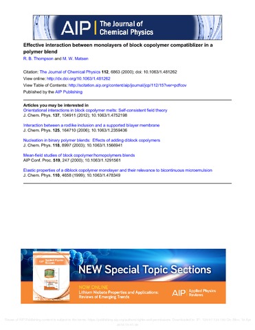 Thompson, R. B. and Matsen, M. W. (2000) Effective interaction between monolayers of block copolymer compatiblizer in a polymer blend. The Journal of Chemical Physics, 112 (15). 6863. ISSN 0021-9606 doi: 10.1063/1.481262