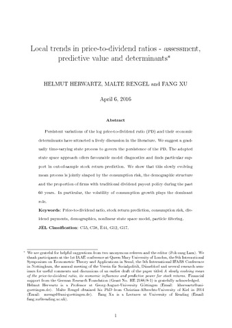 Herwartz, H., Rengel, M. and Xu, F. (2016) Local trends in price-to-dividend ratios - assessment, predictive value and determinants. Journal of Money, Credit and Banking, 48 (8). pp. 1655-1690. ISSN 1538-4616 doi: 10.1111/jmcb.12370