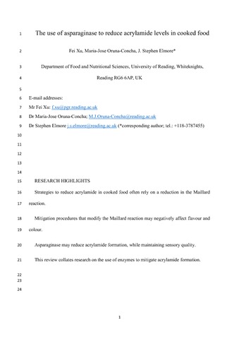 Xu, F., Oruna-Concha, M.-J. orcid id iconORCID: https://orcid.org/0000-0001-7916-1592 and Elmore, J. S. orcid id iconORCID: https://orcid.org/0000-0002-2685-1773 (2016) The use of asparaginase to reduce acrylamide levels in cooked food. Food Chemistry, 210. pp. 163-171. ISSN 0308-8146 doi: 10.1016/j.foodchem.2016.04.105
