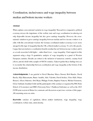 What explains cross-national variation in wage inequality? Research in comparative political economy stresses the importance of the welfare state and wage coordination in reducing not only disposable income inequality but also gross earnings inequality. However, the cross-national variation in gross earnings inequality between median and low income workers is at odds with this conventional wisdom: the German coordinated market economy is now more unequal in this type of inequality than the UK, a liberal market economy. To solve this puzzle, I argue that non-inclusive coordination benefits median but not bottom income workers and is as a result associated with higher – rather than lower - wage inequality. I find support for this argument using a large N quantitative analysis of wage inequality in a panel of Western European countries. Results are robust to the inclusion of numerous controls, country fixed effects, and also hold with a sample of OECD countries. Taken together these findings force us to reconsider the relationship between coordination and wage inequality at the bottom of the income distribution.
