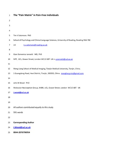 Salomons, T. V., Iannetti, G. D., Liang, M. and Wood, J. N. (2016) The “pain matrix” in pain-free individuals. JAMA Neurology, 73 (6). pp. 755-756. ISSN 2168-6149 doi: 10.1001/jamaneurol.2016.0653