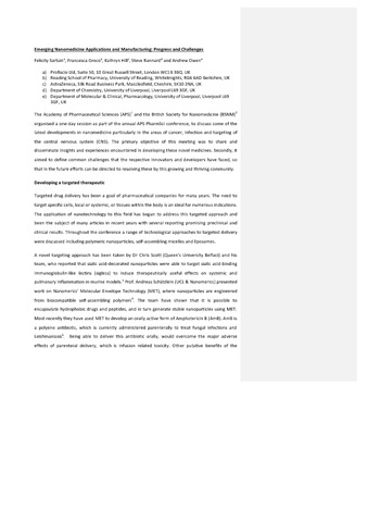 Sartain, F., Greco, F., Hill, K., Rannard, S. and Owen, A. (2016) Emerging nanomedicine applications and manufacturing: progress and challenges. Nanomedicine, 11 (6). pp. 577-580. ISSN 1748-6963 doi: 10.2217/nnm.16.17