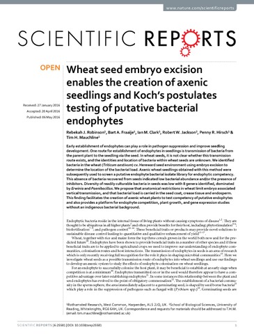 Robinson, R. J., Fraaije, B. A., Clark, I. M., Jackson, R. W., Hirsch, P. R. and Mauchline, T. H. (2016) Wheat seed embryo excision enables the creation of axenic seedlings and Koch’s postulates testing of putative bacterial endophytes. Scientific Reports, 6. 25581. ISSN 2045-2322 doi: 10.1038/srep25581