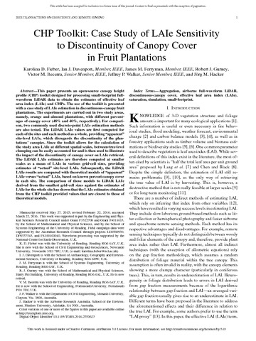 Fieber, K. D., Davenport, I. J., Ferryman, J. M., Gurney, R. J., Becerra, V. M., Walker, J. P. and Hacker, J. M. (2016) CHP toolkit: case study of LAIe sensitivity to discontinuity of canopy cover in fruit plantations. IEEE Transactions on Geoscience and Remote Sensing, 54 (9). pp. 5071-5080. ISSN 0196-2892 doi: 10.1109/TGRS.2016.2550623