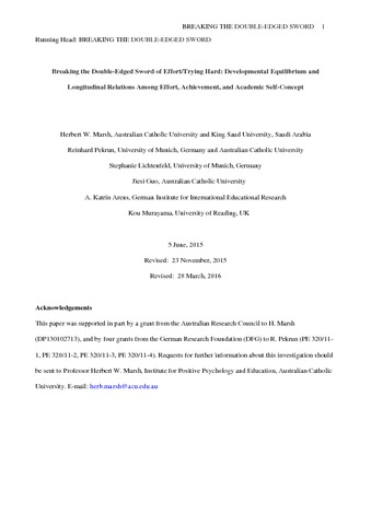 Marsh, H. W., Pekrun, R., Lichtenfeld, S., Arens, A. K. and Murayama, K. (2016) Breaking the double-edged sword of effort/trying hard: developmental equilibrium and longitudinal relations among effort, achievement, and academic self-concept. Developmental Psychology, 52 (8). pp. 1273-1290. ISSN 1939-0599 doi: 10.1037/dev0000146
