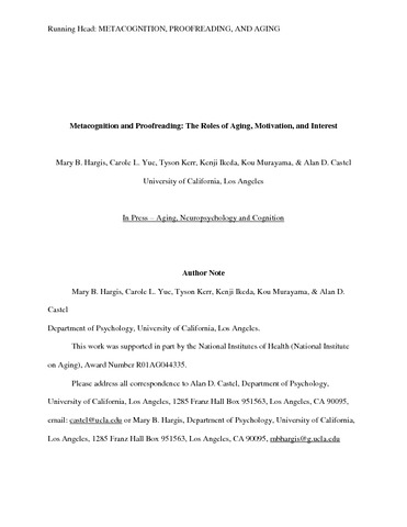 Hargis, M. B., Yue, C. L., Kerr, T., Ikeda, K., Murayama, K. and Castel, A. D. (2017) Metacognition and proofreading: the roles of aging, motivation, and interest. Aging, Neuropsychology and Cognition, 24 (2). pp. 216-226. ISSN 1744-4128 doi: 10.1080/13825585.2016.1182114