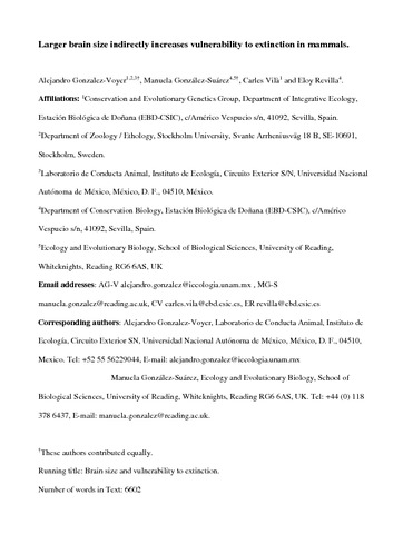 Larger brain size indirectly increases vulnerability to extinction in mammals.