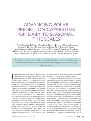 Jung, T., Gordon, N. D., Bauer, P., Bromwich, D. H., Chevallier, M., Day, J. J., Dawson, J., Doblas-Reyes, F., Fairall, C., Goessling, H. F., Holland, M., Inoue, J., Iversen, T., Klebe, S., Lemke, P., Losch, M., Makshtas, A., Mills, B., Nurmi, P., Perovich, D., Reid, P., Renfrew, I. A., Smith, G., Svensson, G., Tolstykh, M. and Yang, Q. (2016) Advancing polar prediction capabilities on daily to seasonal time scales. Bulletin of the American Meteorological Society, 97 (9). pp. 1631-1647. ISSN 1520-0477 doi: 10.1175/BAMS-D-14-00246.1
