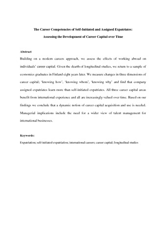 Building on a modern careers approach, we assess the effects of working abroad on individuals’ career capital. Given the dearth of longitudinal studies, we return to a sample of economics graduates in Finland eight years later. We measure changes in three dimensions of career capital; ‘knowing how’, ‘knowing whom’, ‘knowing why’ and find that company assigned expatriates learn more than self-initiated expatriates. All three career capital areas benefit from international experience and all are increasingly valued over time. Based on our findings we conclude that a dynamic notion of career capital acquisition and use is needed. Managerial implications include the need for a wider view of talent management for international businesses.