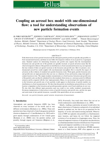 Kivekäs, N., Carpman, J., Roldin, P., Leppä, J., O'Connor, E. J., Kristensson, A. and Asmi, E. (2016) Coupling an aerosol box model with one-dimensional flow: a tool for understanding observations of new particle formation events. Tellus B, 68 (1). 29706. ISSN 1600-0889 doi: 10.3402/tellusb.v68.29706