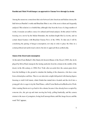 Elduque, A. (2016) Pasolini and Third World hunger: an approach to Cinema Novo through 'La ricotta'. Journal of Italian Cinema and Media Studies, 4 (3). pp. 369-385. ISSN 20477368 doi: 10.1386/jicms.4.3.335_7