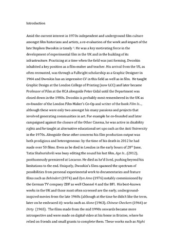 This dossier aims to consider the contribution Stephen Dwoskin and his work made to the development of film and its infrastructure in the UK from 1964 when he arrived in the London until his death in 2012. Dwoskin not only straddled different contexts and ideologies about film but advocated for the support of work in a wide variety of forms. Because of this he was not easily categorizeable. Much of the work analyzing his camera work and his contribution to film is written in French and there is little, particularly in recent years, in English. As such this dossier constituted an important contribution to the reassessment of a singular avant-garde artist and film maker. (can I use avant garde here?) In the light of his recent death this is a timely moment for a consideration of Dwoskin’s achievements and legacy. As well as having a groundbreaking vision of what film could do, he was an influential figure and constituting force in terms of the milieu and structures that supported the independent film world in the UK for several decades. Much of the literature surrounding this world in the UK has been formed by key figures making sense of their part in history. This dossier aims towards some first steps in historicising his legacy. Two of the proposed texts will be making use of new material to conduct original research made available through the recently acquired Dwoskin Archive at University of Reading. Due to Dowksin’s heterogenous involvement in film, there are many ways in which Dwoskin can be considered and the proposed essays will take a range of perspectives to assess and analyse his contribution.