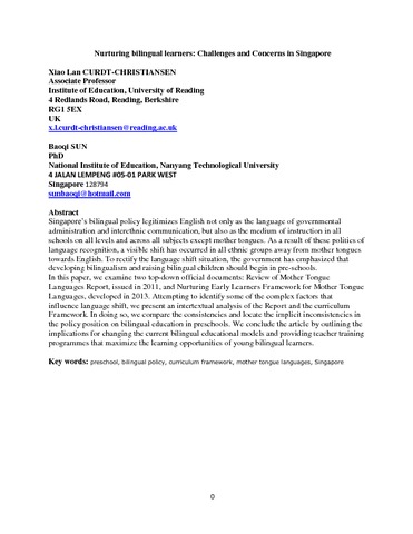 Curdt-Christiansen, X.-L. and Sun, B. (2016) Nurturing bilingual learners: challenges and concerns in Singapore. International Journal of Bilingual Education and Bilingualism, 19 (6). pp. 689-705. ISSN 1367-0050 doi: 10.1080/13670050.2016.1181606