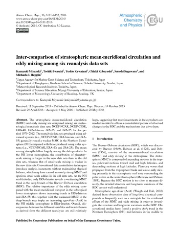 Miyazaki, K., Iwasaki, T., Kawatani, Y., Kobayashi, C., Sugawara, S. and Hegglin, M. I. orcid id iconORCID: https://orcid.org/0000-0003-2820-9044 (2016) Inter-comparison of stratospheric mean-meridional circulation and eddy mixing among six reanalysis data sets. Atmospheric Chemistry and Physics, 16 (10). pp. 6131-6152. ISSN 1680-7316 doi: 10.5194/acp-16-6131-2016