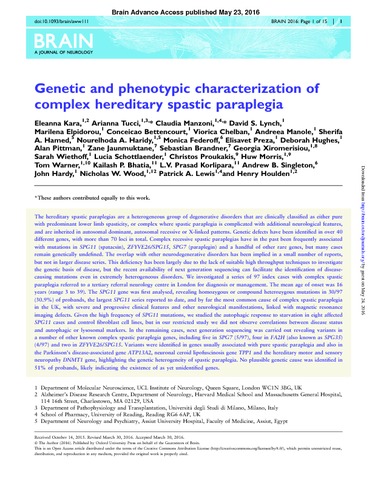 Kara, E., Tucci, A., Manzoni, C., Lynch, D. S., Elpidorou, M., Bettencourt, C., Chelban, V., Manole, A., Hamed, S., Haridy, N., Federoff, M., Preza, E., Hughes, D., Pittman, A., Jaunmuktane, Z., Brandner, S., Xiromerisiou, G., Wiethoff, S., Schottlaender, L., Proukakis, C., Morris, H., Warner, T., Bhatia, K., Korlipara, P., Singleton, A., Hardy, J., Wood, N., Lewis, P. and Houlden, H. (2016) Genetic and phenotypic characterization of complex hereditary spastic paraplegia. Brain : A Journal of Neurology, 139 (7). pp. 1904-1918. ISSN 1460-2156 doi: 10.1093/brain/aww111