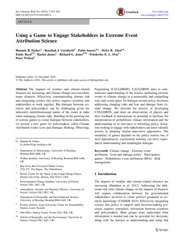 Parker, H., E. Boyd, R. Cornforth, R. James, F. Otto, and M. Allen 2016: Stakeholder perceptions of event attribution in the loss and damage debate. Climate Policy. doi: