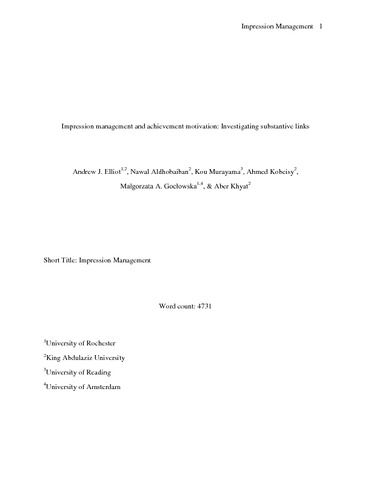 Elliot, A., J., Aldhobaiban, N., Murayama, K., Kobeisy, A., Gocłowska, M. A. and Khyat, A. (2018) Impression management and achievement motivation: investigating substantive links. International Journal of Psychology, 53 (1). pp. 16-22. ISSN 0020-7594 doi: 10.1002/ijop.12252