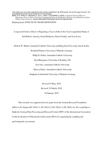 Marsh, H. W., Pekrun, R., Parker, P. D., Murayama, K., Guo, J., Dicke, T. and Lichtenfeld, S. (2017) Long-term positive effects of repeating a year in school: six-year longitudinal study of self-beliefs, anxiety, social relations, school grades, and test scores. Journal of Educational Psychology, 109 (3). pp. 425-438. ISSN 1939-2176 doi: 10.1037/edu0000144