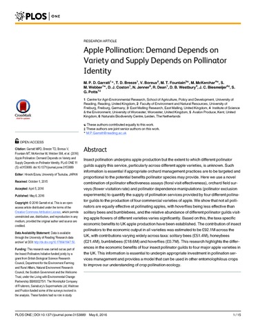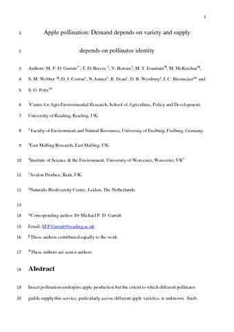 Garratt, M. P. D. orcid id iconORCID: https://orcid.org/0000-0002-0196-6013, Breeze, T. D. orcid id iconORCID: https://orcid.org/0000-0002-8929-8354, Boreux, V., Fountain, M. T., McKerchar, M., Webber, S. M., Coston, D. J., Jenner, N., Dean, R., Westbury, D. B., Biesmeijer, J. C. and Potts, S. G. orcid id iconORCID: https://orcid.org/0000-0002-2045-980X (2016) Apple pollination: demand depends on variety and supply depends on pollinator identity. PLoS ONE, 11 (5). e0153889. ISSN 1932-6203 doi: 10.1371/journal.pone.0153889