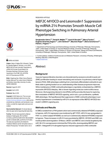 Sahoo, S., Meijles, D. N., Al Ghouleh, I., Tandon, M., Cifuentes-Pagano, E., Sembrat, J., Rojas, M., Goncharova, E. and Pagano, P. J. (2016) MEF2C-MYOCD and leiomodin1 suppression by miRNA-214 promotes smooth muscle cell phenotype switching in pulmonary arterial hypertension. PLoS ONE, 11 (5). e0153780. ISSN 1932-6203 doi: 10.1371/journal.pone.0153780
