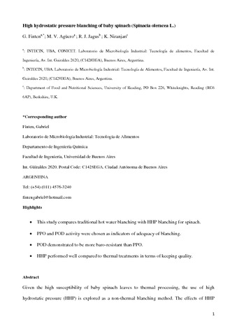 Given the high susceptibility of baby spinach leaves to thermal processing, the use of high hydrostatic pressure (HHP) is explored as a non-thermal blanching method. The effects of HHP were compared with thermal blanching by following residual activity of polyphenol oxidases and peroxidases, colour retention, chlorophyll and carotenoids content, antioxidant capacity and total polyphenols content. Spinach subjected to 700 MPa at 20 ºC for 15 min represented the best treatment among the conditions studied due to its balanced effect on target enzymes and quality indices. The latter treatment reduced enzyme activities of polyphenol oxidases and peroxidases by 86.4 and 76.7 %, respectively. Furthermore, leaves did not present changes in colour and an increase by 13.6 % and 15.6 % was found in chlorophyll and carotenoids content, respectively; regarding phytochemical compounds, retentions of 28.2 % of antioxidant capacity and 77.1 % of polyphenols content were found. Results demonstrated that HHP (700 MPa) at room temperature, when compared with thermal treatments, presented better retention of polyphenols, not significantly different chlorophyll and carotenoids content and no perceptible differences in the instrumental colour evaluated through ΔE value; therefore, it can be considered a realistic practical alternative to the widely used thermal blanching.