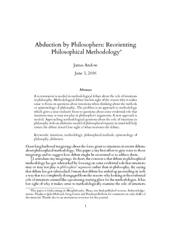 Andow, J. (2016) Abduction by philosophers: reorienting philosophical methodology. Metaphilosophy, 47 (3). pp. 353-370. ISSN 1467-9973 doi: 10.1111/meta.12191