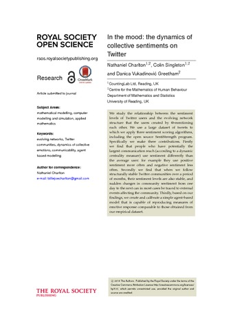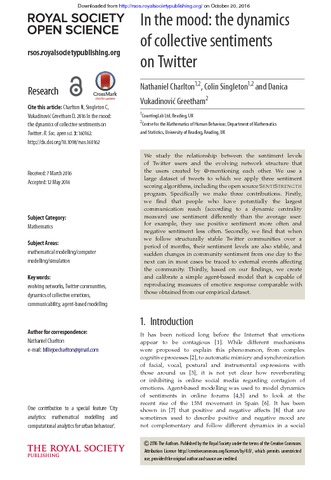 Charlton, N., Singleton, C. and Greetham, D. V. (2016) In the mood: the dynamics of collective sentiments on Twitter. Royal Society Open Science, 3 (6). 160162. ISSN 2054-5703 doi: 10.1098/rsos.160162