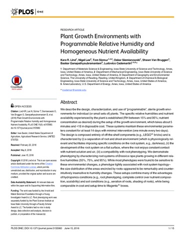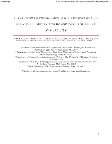 Lind, K. A., Lee, N., Sizmur, T. orcid id iconORCID: https://orcid.org/0000-0001-9835-7195, Siemianowski, O., Van Bruggen, S., Ganapathysubramaniam, B. and Cademartiri, L. (2016) Plant growth environments with programmable relative humidity and homogeneous nutrient availability. PLoS ONE, 11 (6). e0155960. ISSN 1932-6203 doi: 10.1371/journal.pone.0155960