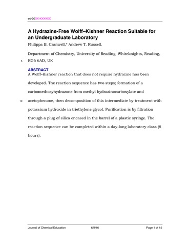 Cranwell, P. B. orcid id iconORCID: https://orcid.org/0000-0001-7156-5576 and Russell, A. T. (2016) A hydrazine-free Wolff–Kishner reaction suitable for an undergraduate laboratory. Journal of Chemical Education, 93 (5). pp. 949-952. ISSN 0021-9584 doi: 10.1021/acs.jchemed.5b00954