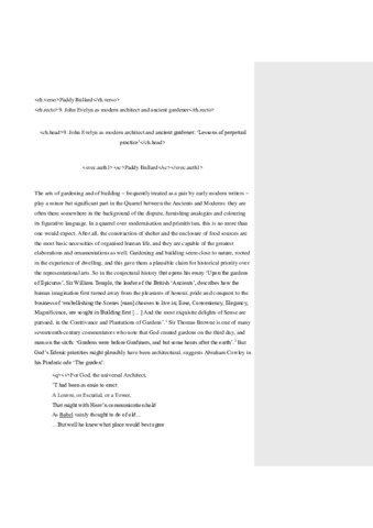 Bullard, P. orcid id iconORCID: https://orcid.org/0000-0001-7193-0844 (2016) John Evelyn as modern architect and ancient gardener: 'lessons of perpetual practice'. In: Bullard, P. orcid id iconORCID: https://orcid.org/0000-0001-7193-0844 and Tadié, A. (eds.) Ancients and moderns in Europe: comparative perspectives. Oxford University Studies in the Enlightenment. Voltaire Foundation. University of Oxford, Oxford, pp. 171-188. ISBN 9780729411776