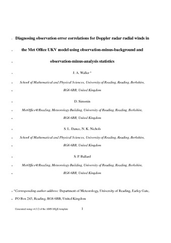 Diagnosing observation error correlations for Doppler radar radial winds in the Met Office UKV model using observation-minus-background and observation-minus-analysis statistics.