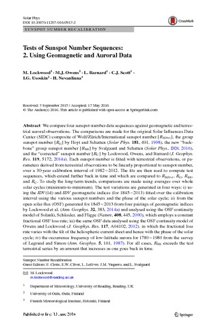 Lockwood, M. orcid id iconORCID: https://orcid.org/0000-0002-7397-2172, Owens, M. J. orcid id iconORCID: https://orcid.org/0000-0003-2061-2453, Barnard, L. orcid id iconORCID: https://orcid.org/0000-0001-9876-4612, Scott, C. J. orcid id iconORCID: https://orcid.org/0000-0001-6411-5649, Usoskin, I. G. and Nevanlinna, H. (2016) Tests of sunspot number sequences: 2. Using geomagnetic and auroral data. Solar Physics, 291 (9-10). pp. 2811-2828. ISSN 1573-093X doi: 10.1007/s11207-016-0913-2