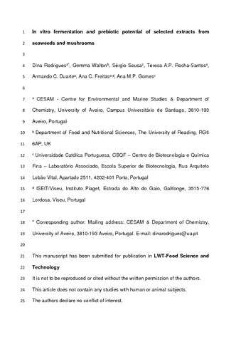 Rodrigues, D., Walton, G. orcid id iconORCID: https://orcid.org/0000-0001-5426-5635, Sousa, S., Rocha-Santos, T. A. P., Duarte, A. C., Freitas, A. C. and Gomes, A. M. P. (2016) In vitro fermentation and prebiotic potential of selected extracts from seaweeds and mushrooms. LWT Food Science and Technology, 73. pp. 131-139. ISSN 0023-6438 doi: 10.1016/j.lwt.2016.06.004