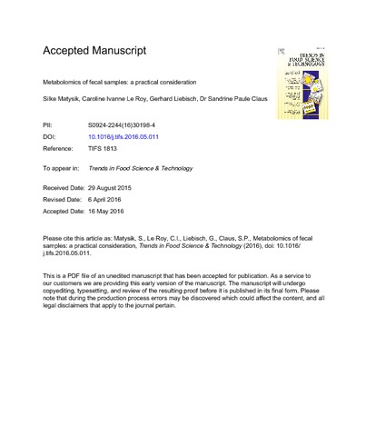 Matysik, S., Le Roy, C. I., Liebisch, G. and Claus, S. P. (2016) Metabolomics of fecal samples: a practical consideration. Trends in Food Science and Technology, 57. pp. 244-255. ISSN 0924-2244 doi: 10.1016/j.tifs.2016.05.011