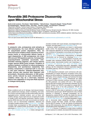 Livnat-Levanon, N., Kevei, É. orcid id iconORCID: https://orcid.org/0000-0002-0560-9208, Kleifeld, O., Krutauz, D., Segref, A., Rinaldi, T., Erpapazoglou, Z., Cohen, M., Reis, N., Hoppe, T. and Glickman, M. H. (2014) Reversible 26S proteasome disassembly upon mitochondrial stress. Cell reports, 7 (5). pp. 1371-1380. ISSN 2211-1247 doi: 10.1016/j.celrep.2014.04.030