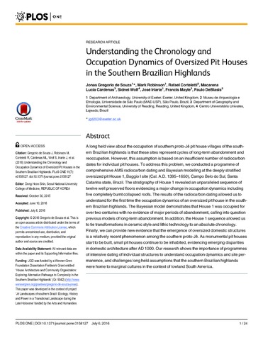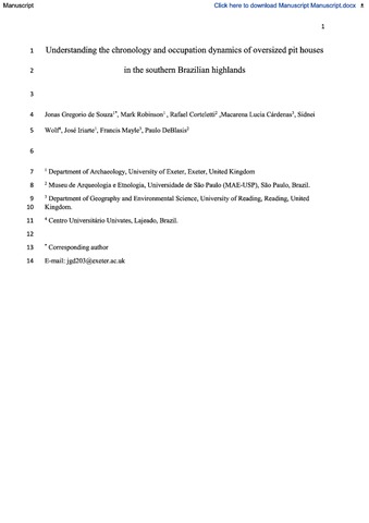 de Souza, J. G., Robinson, M., Corteletti, R., Cárdenas, M. L., Wolf, S., Iriarte, J., Mayle, F. orcid id iconORCID: https://orcid.org/0000-0001-9208-0519 and DeBlasis, P. (2016) Understanding the chronology and occupation dynamics of oversized pit houses in the southern Brazilian highlands. PLoS ONE, 11 (7). e0158127. ISSN 1932-6203 doi: 10.1371/journal.pone.0158127