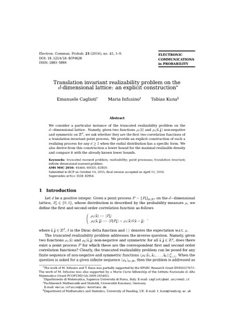 Kuna, T., Caglioti, E. and Infusino, M. (2016) Translation invariant realizability problem on the d-dimensional lattice: an explicit construction. Electronic Communications in Probability, 21. 45. ISSN 1083-589X doi: 10.1214/16-ECP4620