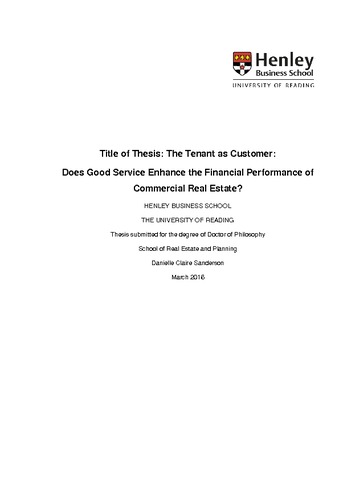 Sanderson, D. C. (2016) The tenant as customer: does good service enhance the financial performance of commercial real estate? PhD thesis, University of Reading.