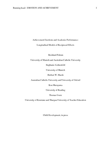 Pekrun, R., Lichtenfeld, S., Marsh, H., W., Murayama, K. and Goetz, T. (2017) Achievement emotions and academic performance: longitudinal models of reciprocal effects. Child Development, 88 (5). pp. 1653-1670. ISSN 0009-3920 doi: 10.1111/cdev.12704