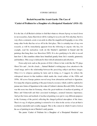 Carville, C. orcid id iconORCID: https://orcid.org/0000-0003-3369-0522 (2015) Beckett beyond the avant-garde: the case of “Casket of Pralinen for a daughter of a dissipated Mandarin". In: Nixon, M. orcid id iconORCID: https://orcid.org/0000-0002-3730-1785 and Pilling, J. (eds.) On in their company: essays on Beckett, with tributes and sketches; presented to Jim Knowlson on his 80th Birthday. Beckett International Foundation, Reading. ISBN 9780704915343